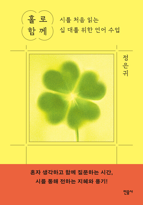 우리 시를 영어로 알리고 영미시를 우리말로 옮기는 일에도 정성을 쏟고 있는 영문학자 정은귀 교수가 시를 처음 읽는 십 대를 위해 『홀로 함께』(민음사)를 출간했다. 시는 현실과 동떨어진 감상이 아니다. “시는 늘 가장 구체적인 현실이고 가장 절박한 외침이며 생생한 역사이고 또 가장 날것의 느낌으로 다가오는 언어다.” 많은 생각을 해야 하는 시기의 젊은이들에게 시야말로 가장 혁신적인 사고를 하게 만드는 문학 장르다. “모든 고민이 실은 비워야 하는 일과 채워야 하는 일 사이의 갈등이었지요.” 이러한 망설임의 연속 가운데 시는 우리에게 생각하는 힘을 길러준다. 결국 시를 읽는다는 건 ‘창의적인 사고’를 가능케 해준다. 시를 읽을 때 “우리는 어제와 다르게 생각하는 나로 새롭게 태어나고, 언어를 통한 사유, 일상의 혁명을 이루어” 나갈 것이다.